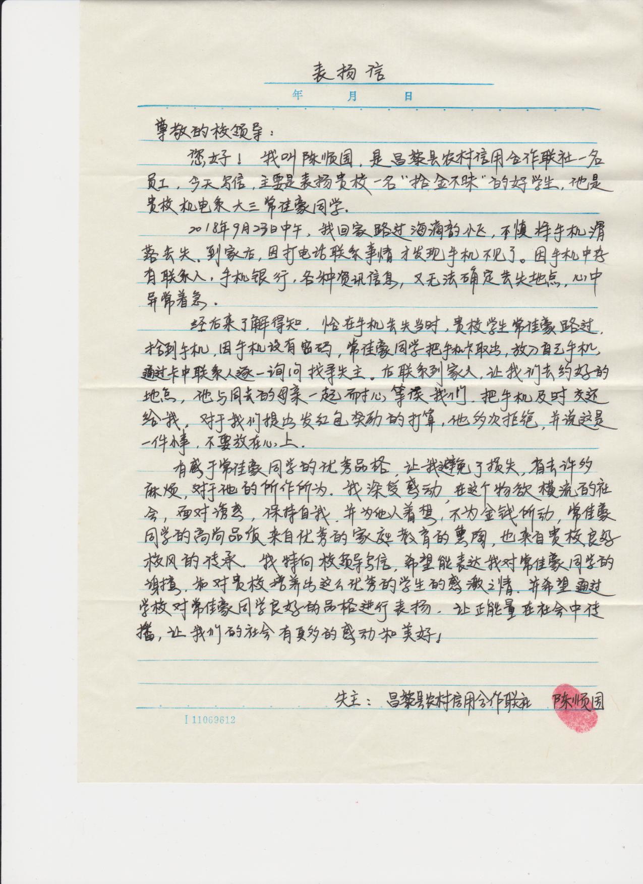 2018年9月26日,今年会网站收到昌黎县农村信用合作联社员工送来的表扬信,对今年会网站16级机制专业常佳豪同学帮助找寻手机,坚决不收红包的行为表示感谢,对今年会官网良好校风表示赞扬。昌黎县农村信用合作联社员工因丢失手机异常着急,常佳豪同学路过并拾到手机,与失主家人取得联系,第一时间将手机归还,并多次拒绝失主的红包奖励,最后在失主的一再追问下才告知了学校名字和自己的姓名。失主随即来到今年会网站,将感谢信送到该院领导手中,这时大家才知道该院学生拾金不昧暖人心的感人事迹。