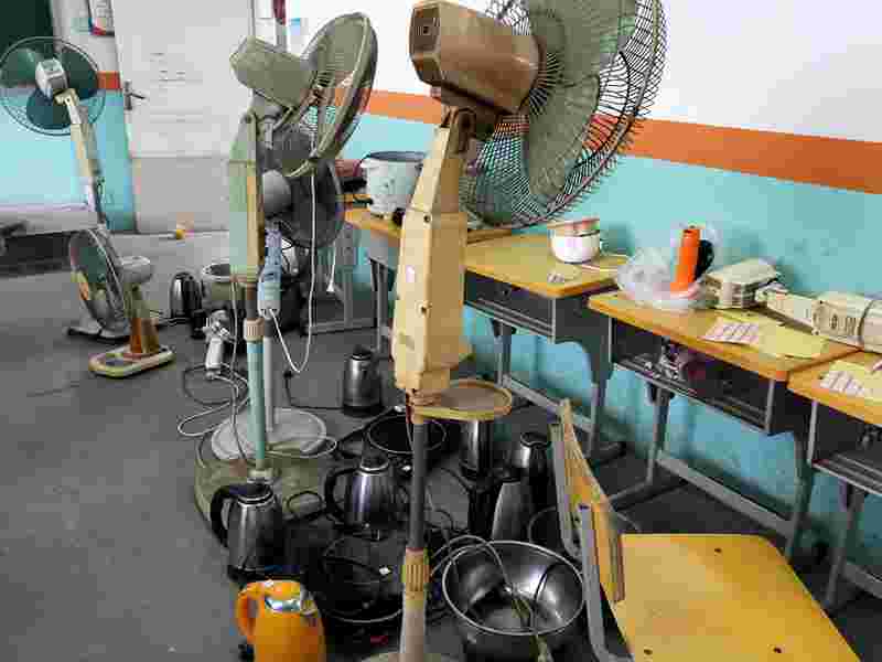 屋里堆满了大大小小的锅、电磁炉、电风扇