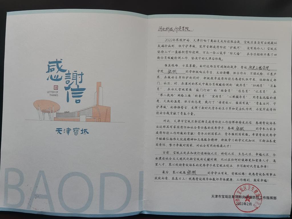 近日,今年会网站19机制张帆同学因在属地积极投身疫情防控志愿者队伍,天津市宝坻区疫情防控指挥部特发来感谢信。